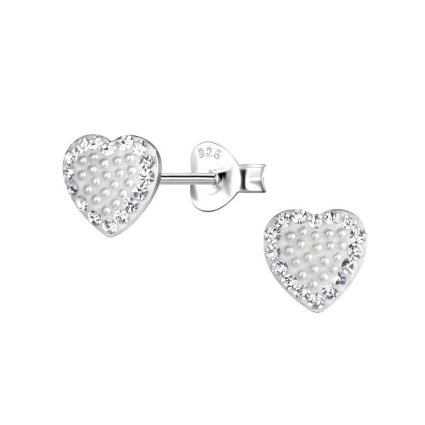 Silver Heart Stud Earrings with Pearl and Crystal