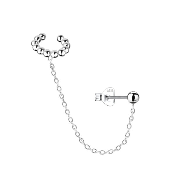 Silver Ball Stud Earrings and Ear Cuff with Chain