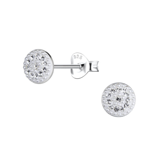Silver Round Stud Earrings with Pearl and Crystal