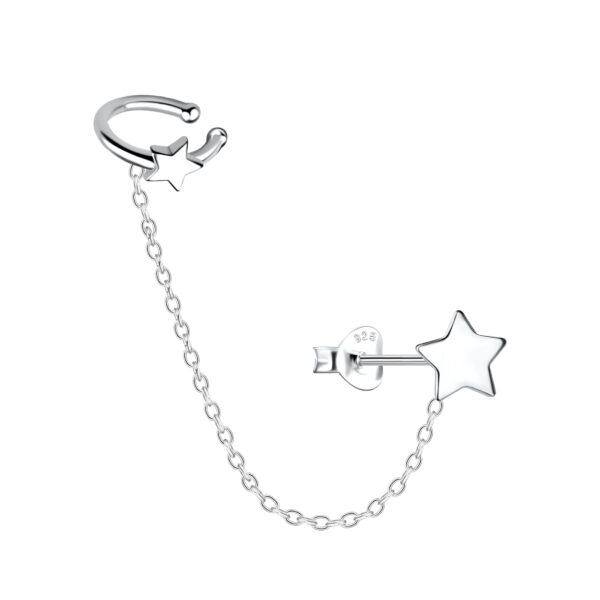 Silver Star Stud Earrings and Ear Cuff with Chain
