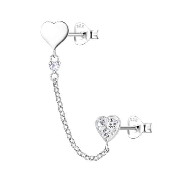 Silver Heart Double Stud Earrings with Chain