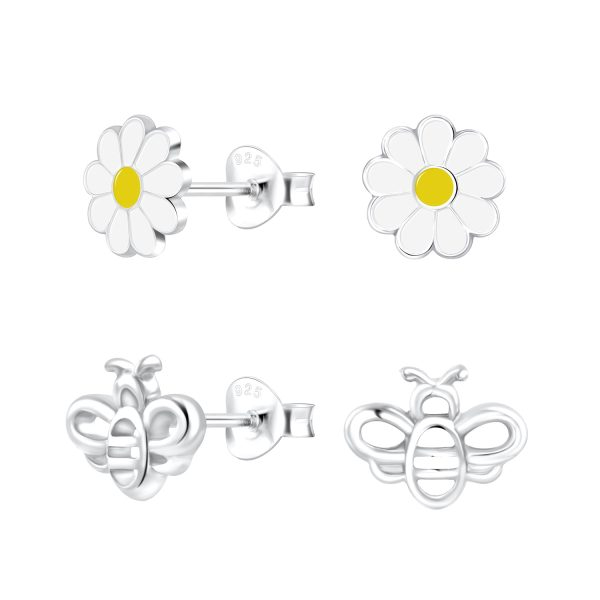Silver Flower and Bee Stud Earrings Set