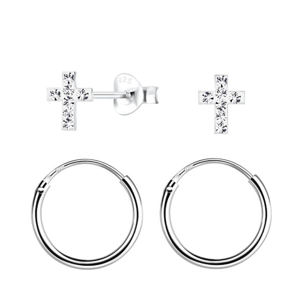 Silver Cross Stud and Hoop Earrings Set