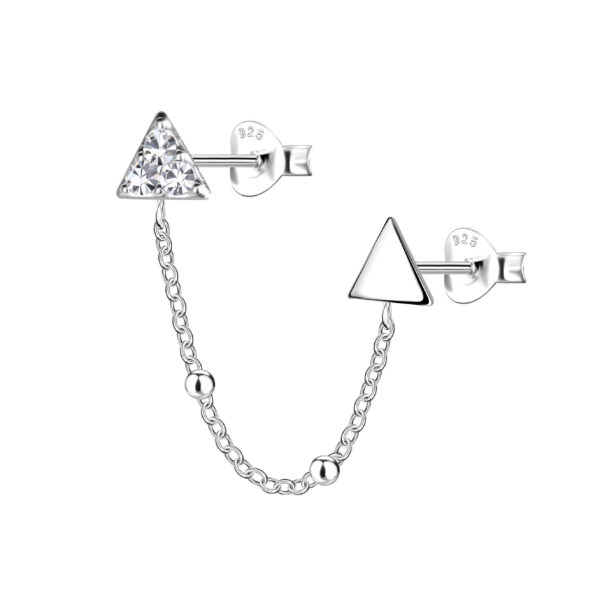 Silver Triangle Double Stud Earrings with Chain