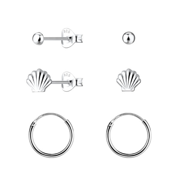 Silver Shell Stud and Hoop Earrings Set