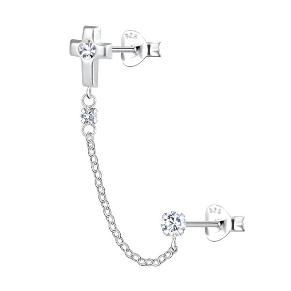 Silver Cross Double Stud Earrings with Chain