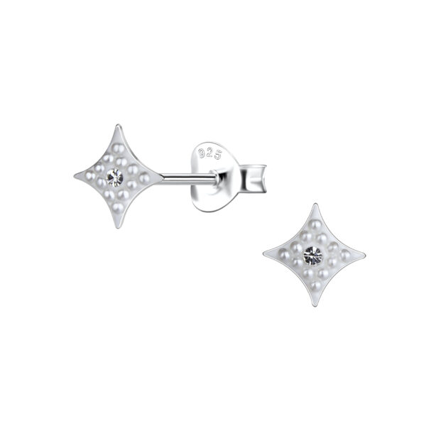 Silver Diamond Shaped Stud Earrings with Pearl and Crystal