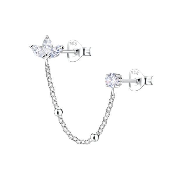 Silver Flower Double Stud Earrings with Chain