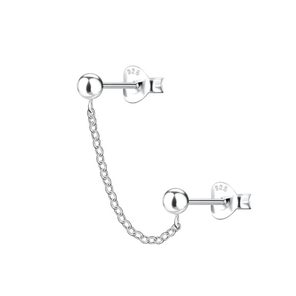 Silver Ball Double Stud Earrings with Chain