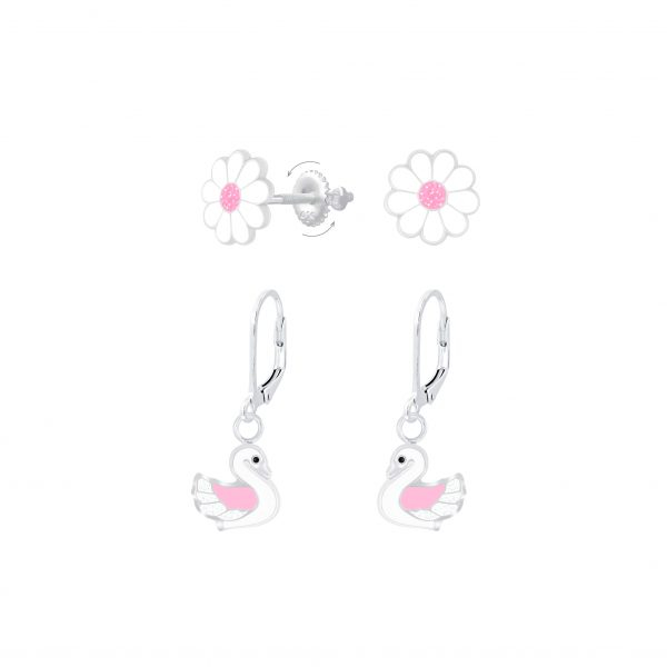 Silver Flower and Swan Earrings Set