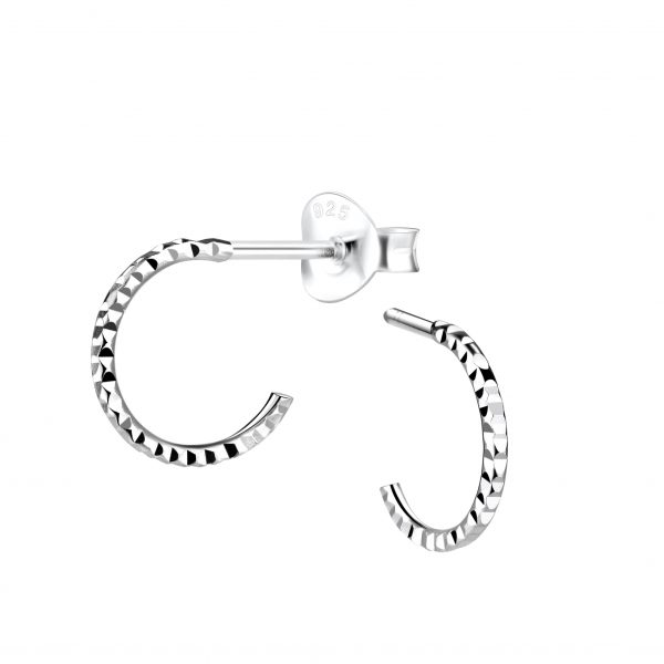 Silver Half Hoop Stud Earrings with Diamond Cut