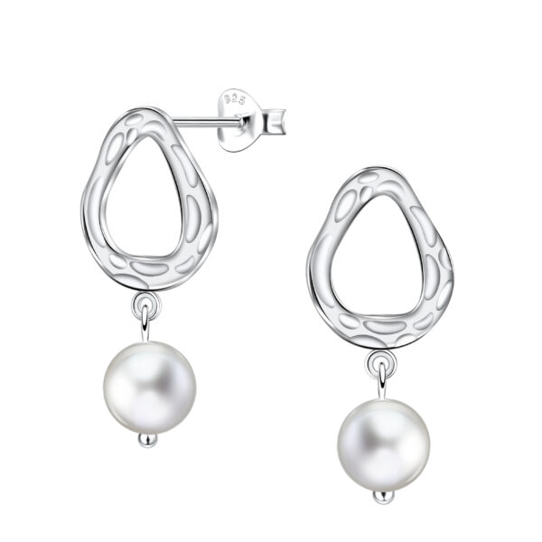 Silver Hammered Geomatric Stud Earrings with Hanging 8mm Pearl