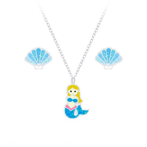 Silver Mermaid Necklace and Shell Stud Earrings Set
