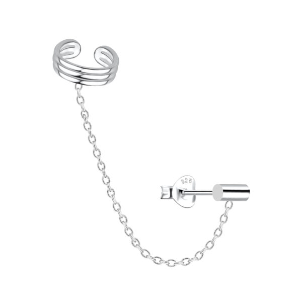 Silver Bar Stud Earrings and Pattern Ear Cuff with Chain