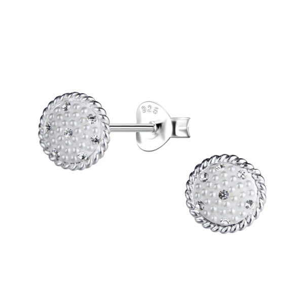 Silver Round Stud Earrings with Pearl and Crystal