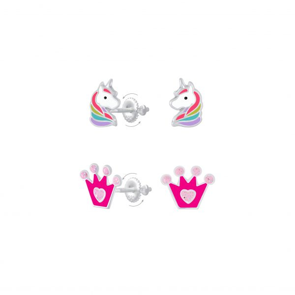Silver Unicorn and Crown Screw Back Earrings Set