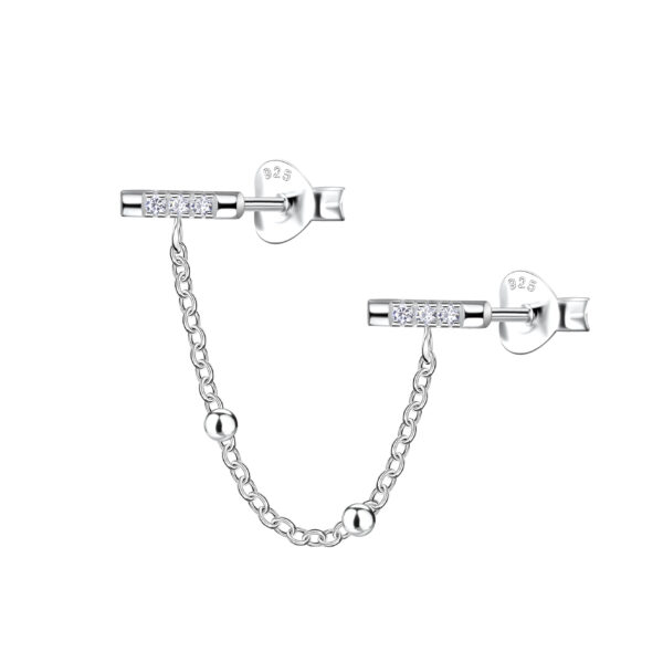 Silver Bar Double Stud Earrings with Chain