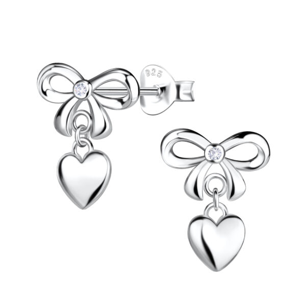 Silver Bow Stud Earrings with Hanging Heart