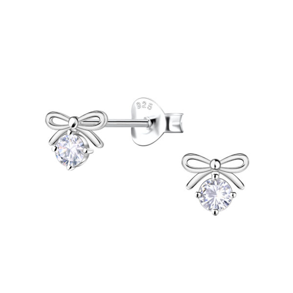 Silver Bow Stud Earrings with Single Stone