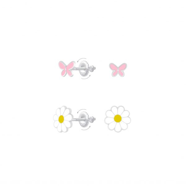 Silver Butterfly and Flower Screw Back Earrings Set