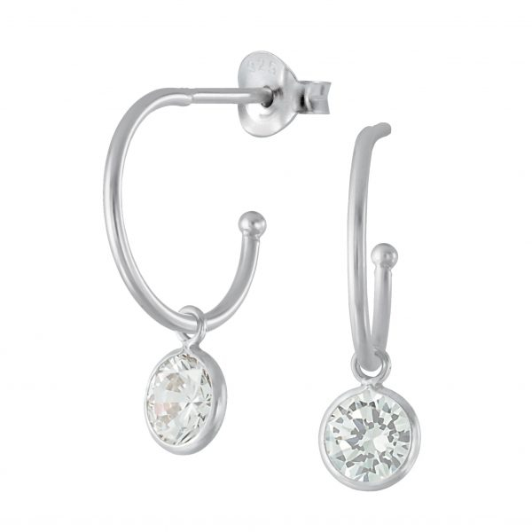 Silver Half Hoop Stud Earrings With Hanging Cubic Zirconia